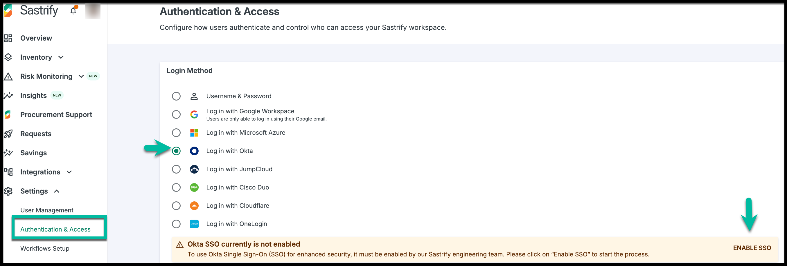 After you click Enable SSO, you’ll see a confirmation message. This also triggers an email from Sastrify with instructions to provide your Okta credentials, which you’ll need to complete Step 3.